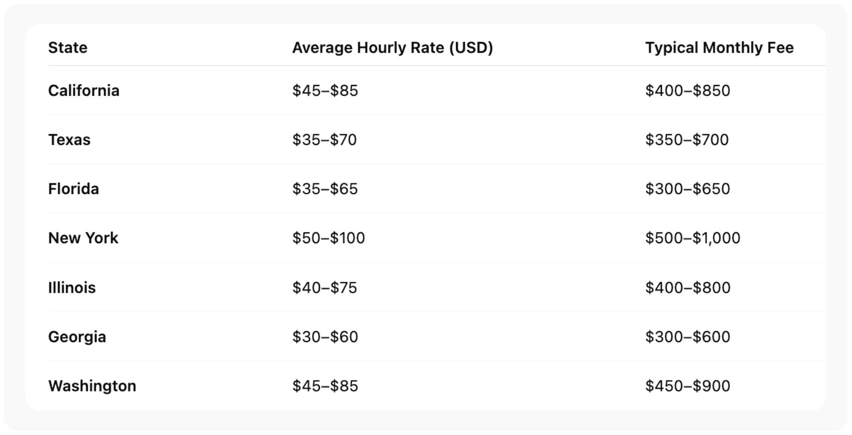 - Business size and complexity – A small e-commerce shop with simple transactions may pay $250/month, while a multi-entity company can expect $1,000+.