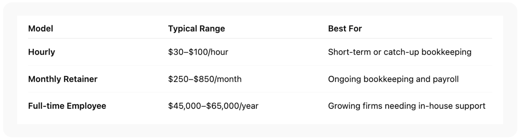 Quick note: If you’re still growing your business, outsourcing to a virtual accounting service often saves 30–40% compared to hiring a full-time bookkeeper.