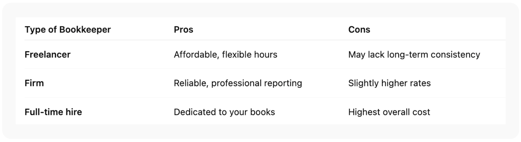 - Bookkeeping firms: Offer team-based support, scalability, and advanced software tools — ideal for small and mid-sized businesses.