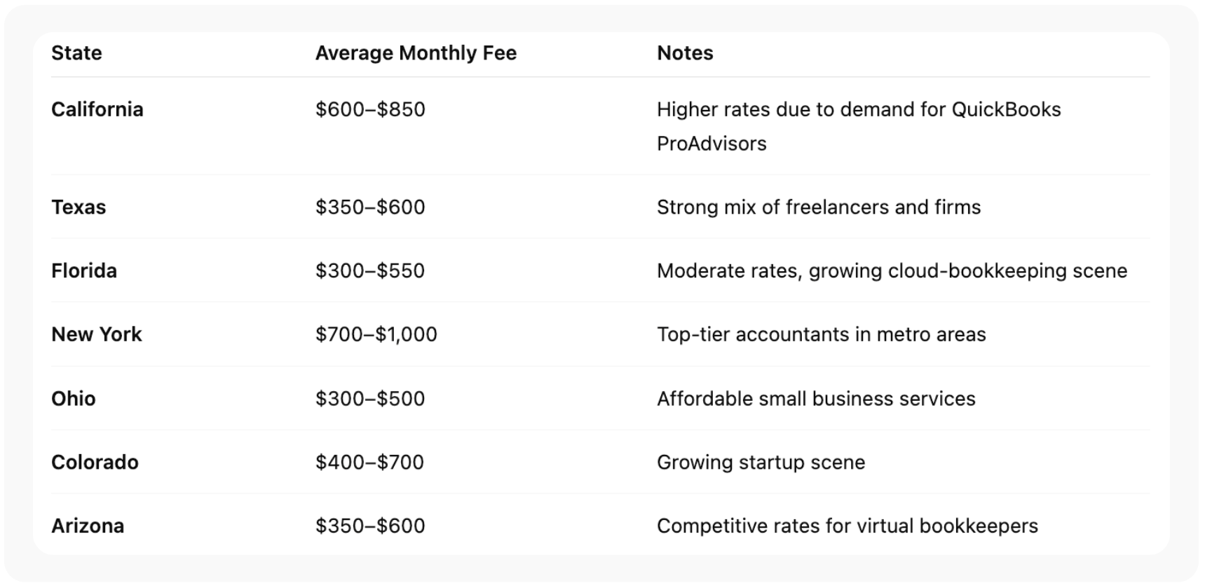 Here’s an overview of average monthly bookkeeping costs by state (for small businesses earning under $1M annually):
