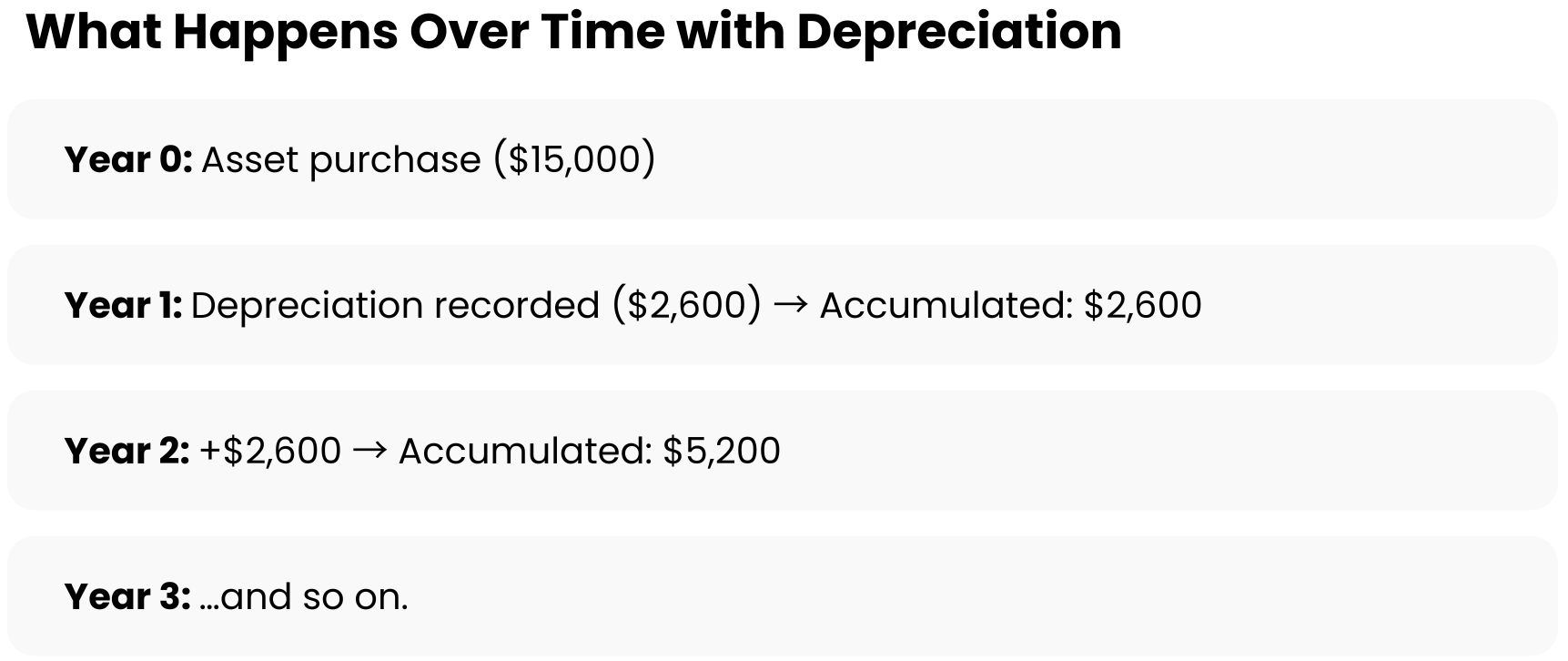 - After two years: 2 × $2,600 = $5,200 accumulated depreciation.