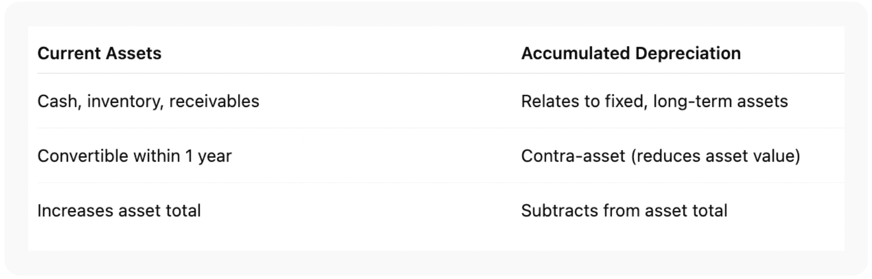 It answers critical questions like “Is accumulated depreciation a current asset” (it’s not) and “Where does accumulated depreciation go on the balance sheet” (right under the related asset).