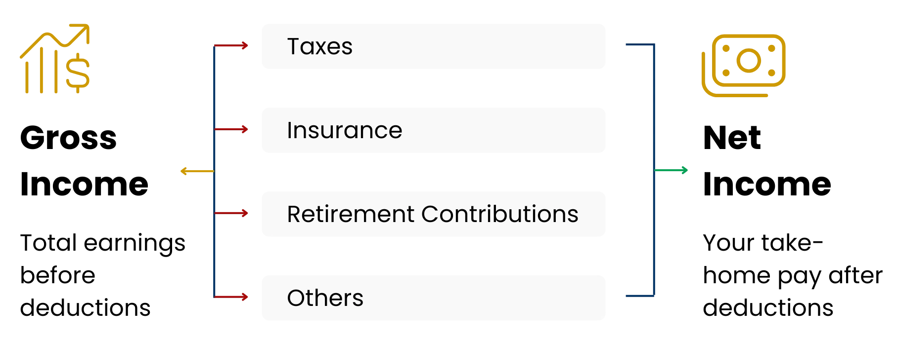 Gross income is your total pay before deductions, but net income is what you take home after taxes, insurance, and other deductions.