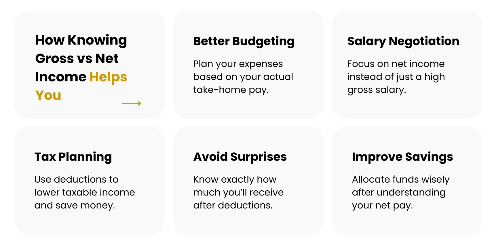 Knowing the difference between gross and net income helps you in many ways. Let’s look at a few below: