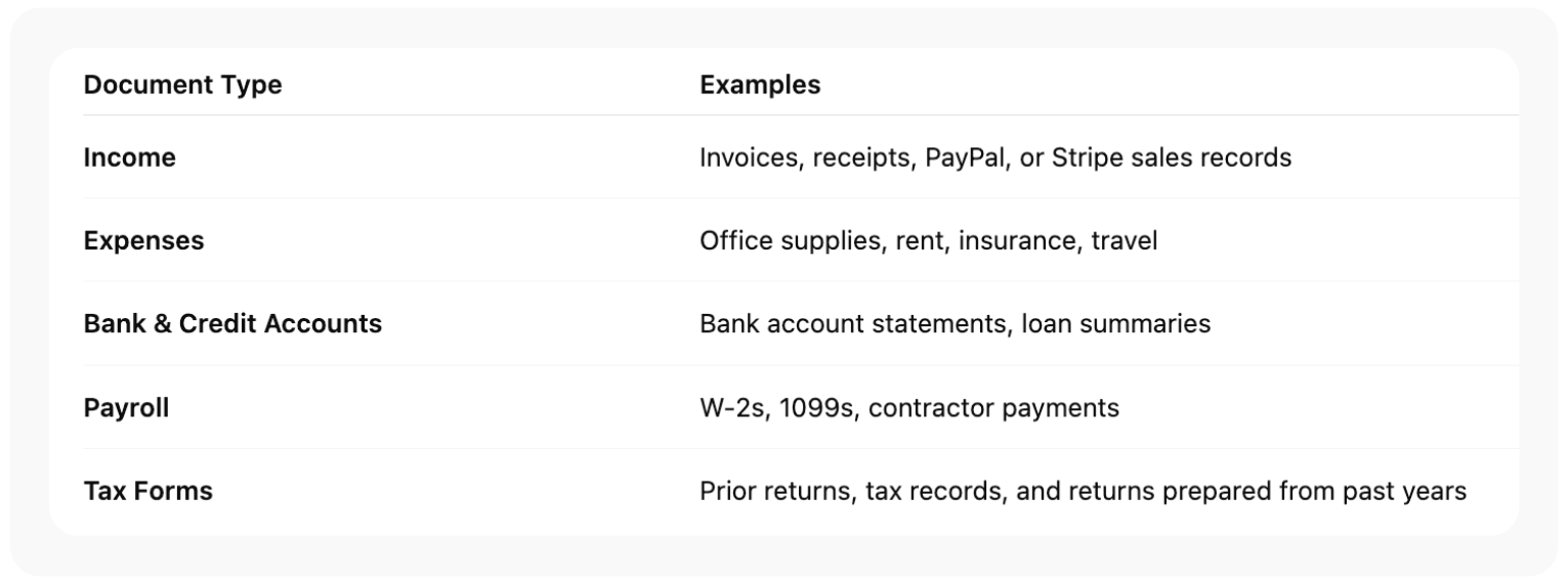 Before starting, gather every document you’ll need for your tax records. Think of this as your business’s year-end collection day. Having your files properly labeled will help when your accountant asks, “Do you have your supporting documentation ready?”