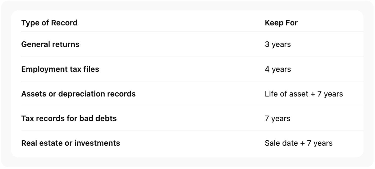 Hold onto all relevant files and supporting documentation until the recommended year from the date your return was filed. Proper retention protects you if the IRS ever requests additional tax records.