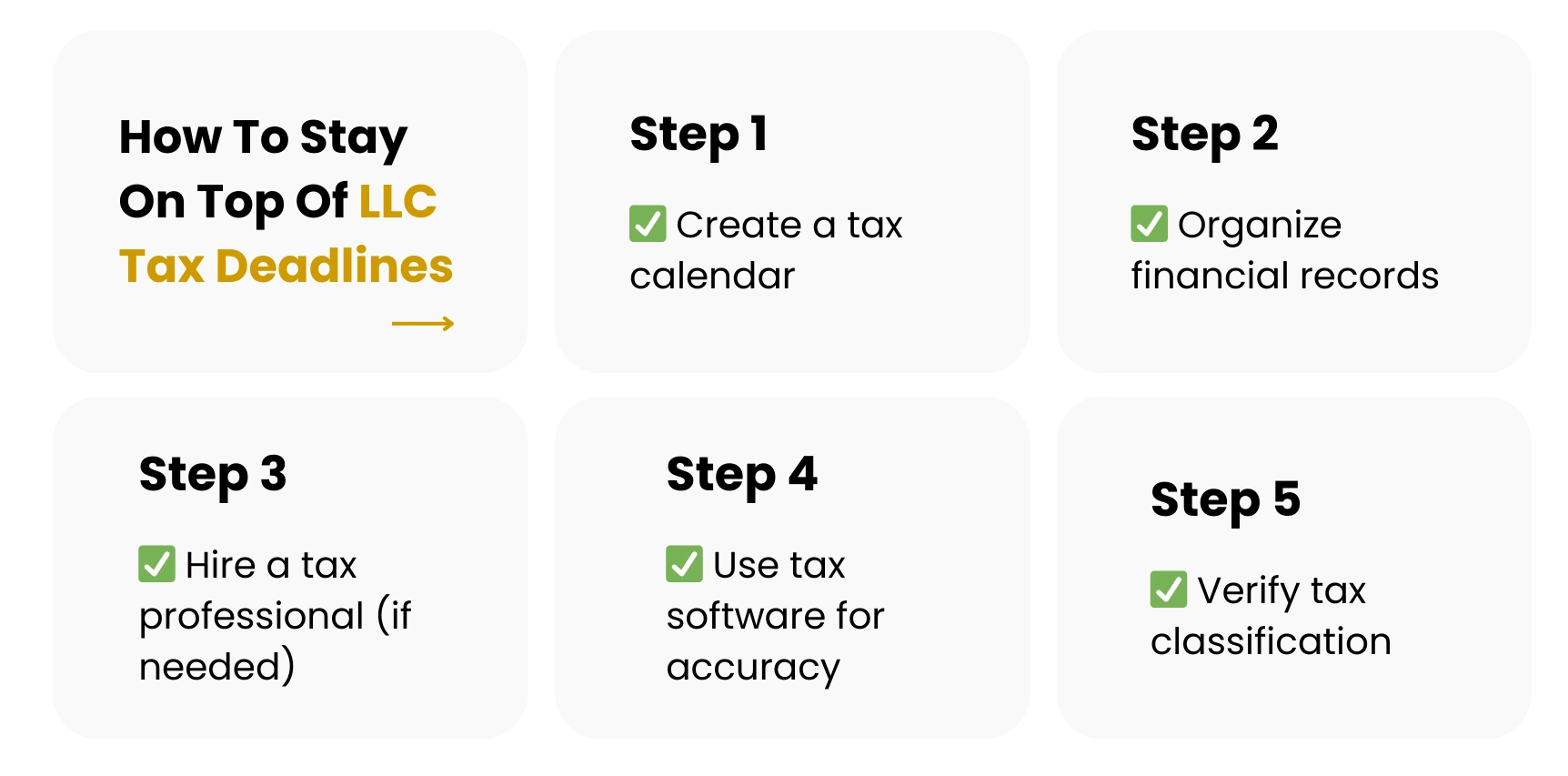 Start by gathering all necessary financial documents, such as income statements and receipts. Confirm your LLC’s tax classification, and work with a tax advisor to identify potential deductions.