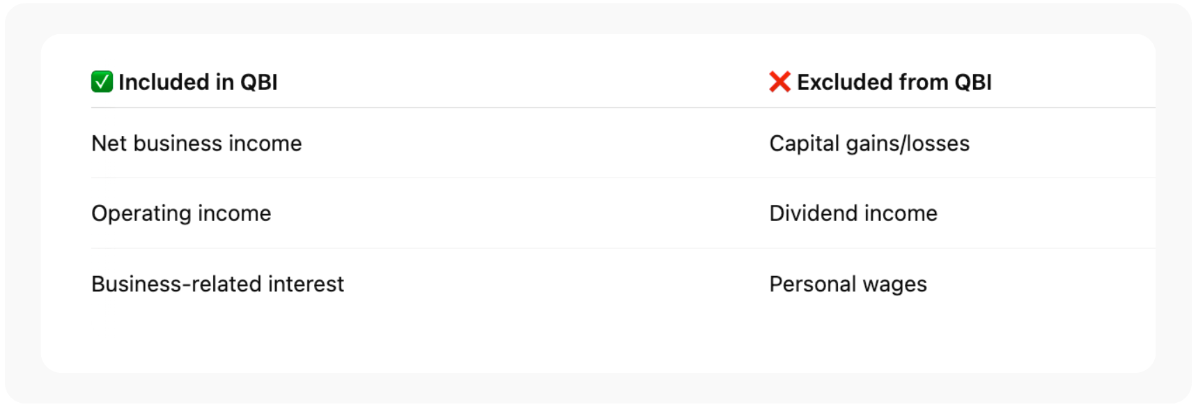 Qualified Business Income (QBI) refers to your business’s net income — after operating expenses, but before taxes. It excludes several types of income such as: