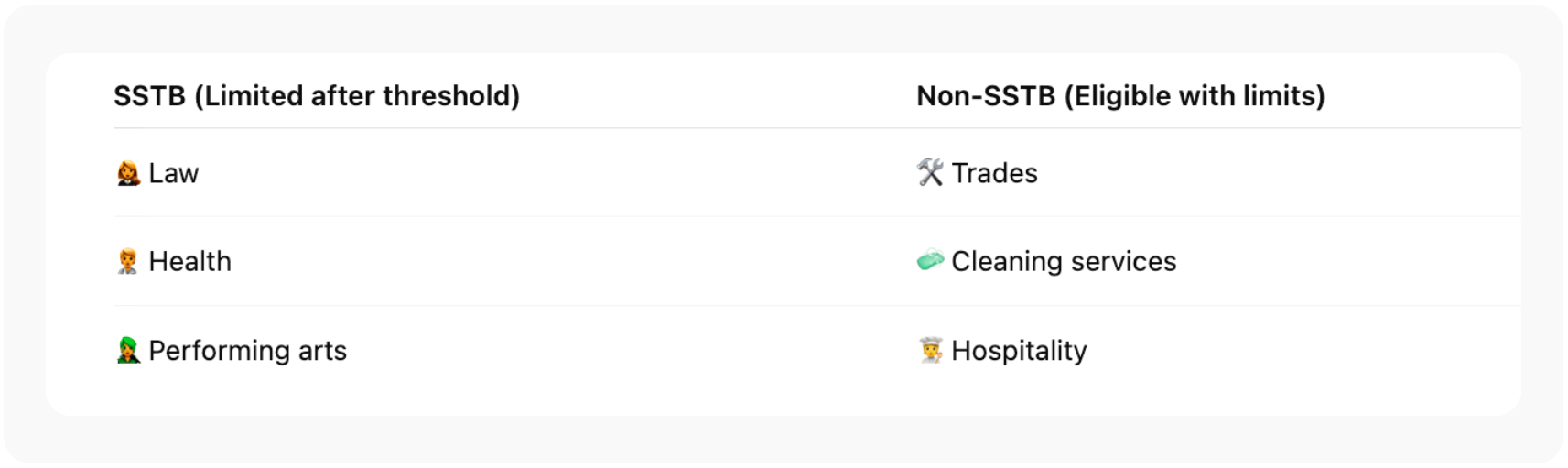 SSTBs include professions in law, accounting, health, consulting, financial services, and performing arts. These businesses face a phase-out of the deduction as income increases beyond the thresholds.