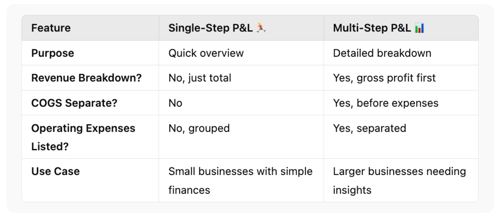 - Single-Step P&L: Summarizes revenue in one line, expenses in another, then net income. Simple but lacks detail.