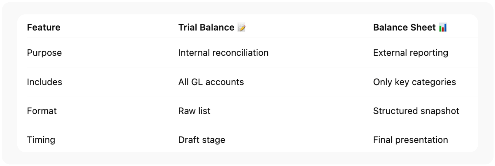 Trial Balance = Draft working document Balance Sheet = Final financial snapshot